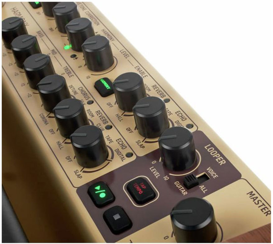 - Регуляторы и переключатели лупера: Уровень, Tap, Play Stop, Voice / All / Guitar