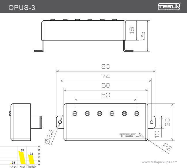 Звукосниматель OPUS-3 изготовлен с использованием медной проволоки с покрытием из формвара и магнитов Alnico. Катушки датчика покрыты воском для обеспечения чистоты звука и устранения «микрофонного» эффекта.