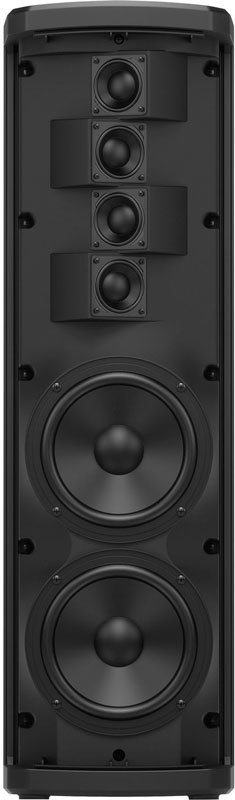 Для формирования звука на высоких частотах, обычные колонки используют один драйвер и рупор. Чаще всего это приводит к тому, что равномерное звучание достигается только перед колонкой а при перемещении от неё в стороны уровень высоких частот начинает заметно падать. В модели iP300 применены 4 ВЧ-драйвера, размещённые под углом друг к другу, что даёт широкое равномерное покрытие во всём звуковом диапазоне по горизонтали. Так, например, для частот до 12500 Гц гарантируется равномерное звучание с углом 90°. Поставив две такие колонки по углам зала, пользователь получает одинаково яркий и разборчивый звук не зависимо от того в какой точке зала окажется слушатель. На низких частотах работают два длинноходовых динамика 6,5 дюймов. Два щелевых порта фазоинвертора расположены на задней панели.