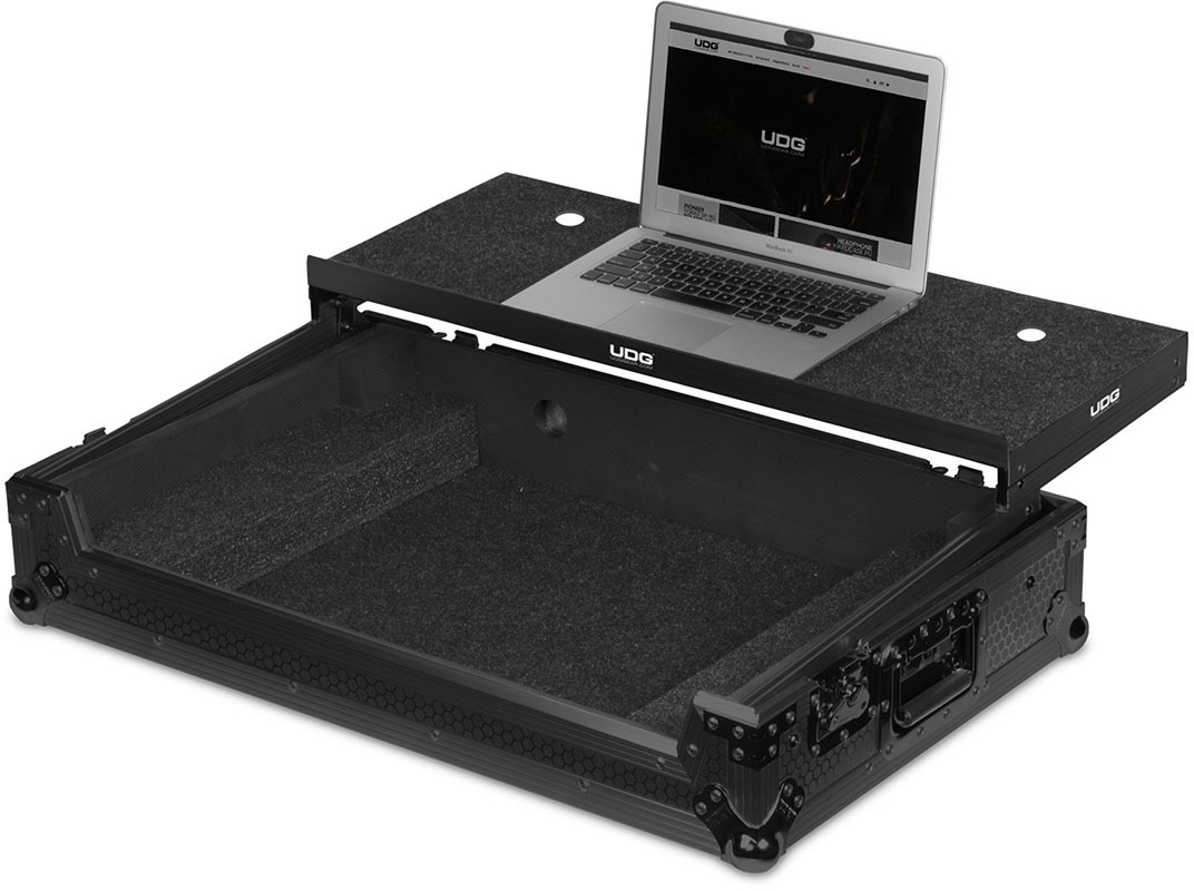 Сверхширокий алюминиевый профиль с черной отделкой и массивные угловые шарики с тиснением в виде логотипа UDG обеспечивают долговечность и сохраняют привлекательный профессиональный дизайн. Кроме того, в кейсе предусмотрена дополнительная полка для ноутбука или любых других устройств, таких как процессор эффектов и интерфейсы. Кейс также оснащен усиленными пружинными ручками для безопасного подъема и загрузки.