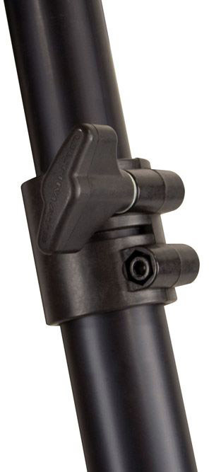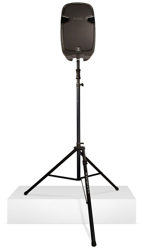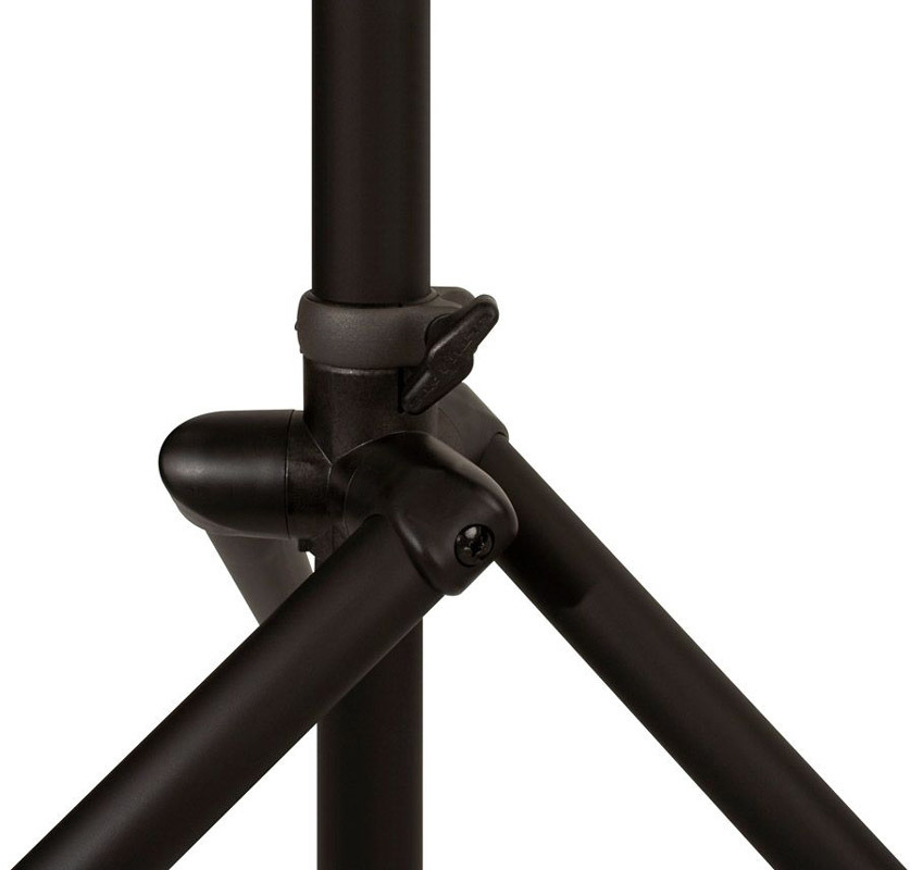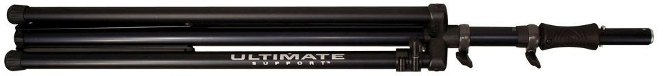 Ultimate TS-110BL алюминиевая спикерная стойка на треноге с подъемным механизмом, высота 1575-2794 мм, регулируемая длина ножки 1016-1346 мм, грузоподъемность до 68.2 кг, вес 6.4 кг, черная. Возможность установки на ступенях.