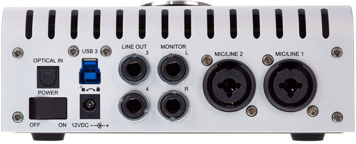 На задней панели располагаются 2 микрофонных/линейных входа, 2 аналоговых выхода, а также 2 выхода для мониторинга с цифровым управлением, оптический вход и USB 3.0 для подключения к компьютеру.