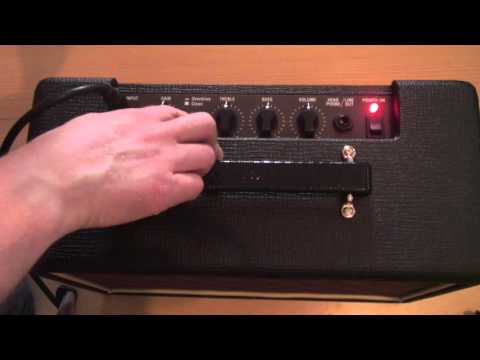 - Регулятор громкости Volume. Определяет общий уровень громкости усилителя. Для получения плотного и яркого чистого звука следует выкрутить этот регулятор, при этом оставить Gain на небольшом уровне (в этом случае не забудьте удостовериться, что переключатель уровня перегрузки выключен), в то время как "подобранный" регулятор VOLUME, нажатый переключатель уровня и поднятая ручка перегрузки дадут Вам жирный, насыщенный перегруженный звук на сравнительно небольшом "щадящем уши соседей" уровне громкости.