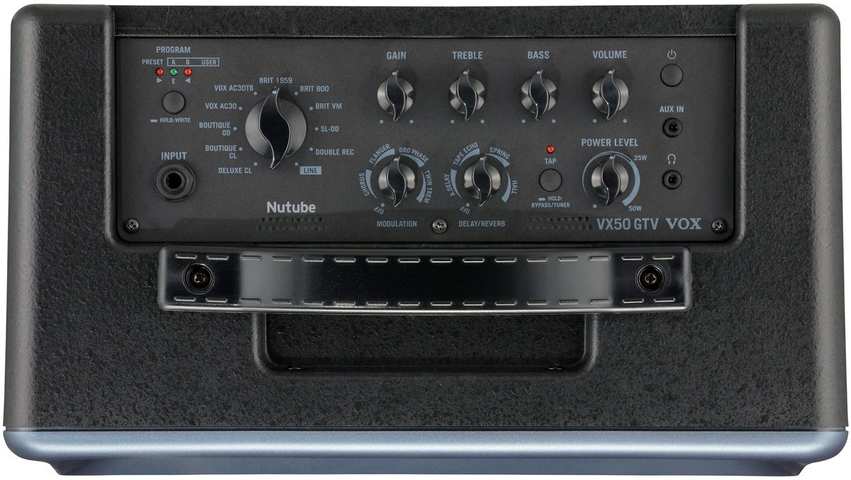 VOX VX50-GTV – лёгкий и компактный 50-ваттный моделирующий комбо, открывающий новые возможности в области гитарного усиления. Модель оснащена вакуумной лампой нового поколения Nutube 6P1 и позволяет получить тёплый, богатый и насыщенный звук, характерный для ламповых усилителей.