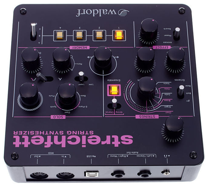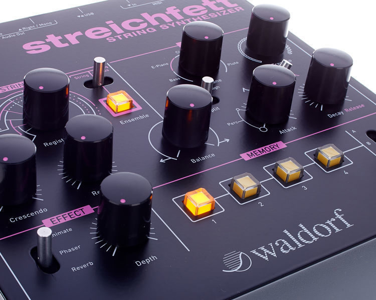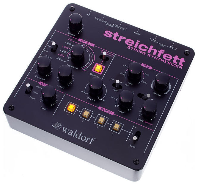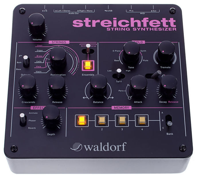 Waldorf Streichfett - аналоговый синтезатор струнных, полностью полифоническая секция струнных: скрипка, альт, виолончель, а также медные духовые, орган и хор, эффект ансамбля для секции струнных, типичная для струнных кривая генератора огибающей с Crescendo и Release