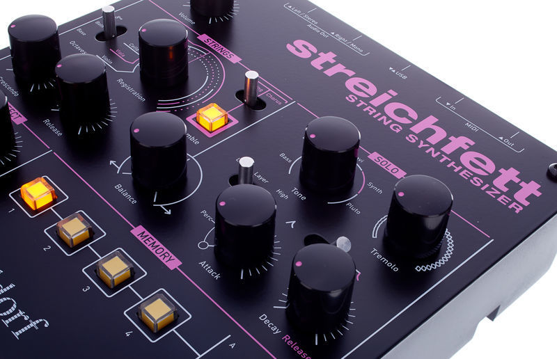 Streichfett сочетает в себе лучшее из временно забытого вида струнных синтезаторов 70-х и ранних 80-х. Его двойной звуковой движок имеет полностью полифоническую струнную секцию и восьмиголосную соло-секцию, которая очень важна для воссоздания звуков старых фильмов 30-тилетней давности. Эффект Ensemble обрабатывает струнную секцию, тогда как функция выбора эффектов позволяет добавить Phaser или Reverb. Кроме того, эффект Animate может быть использован, чтобы модулировать звук струны, позволяя создавать впечатляющие звуковые метаморфозы.