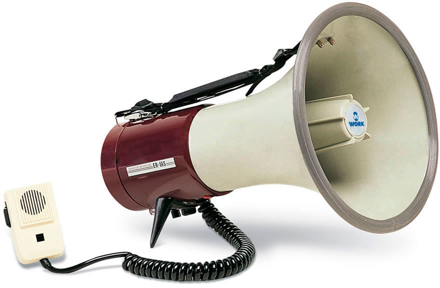 Work ER 56S Наплечный мегафон с выносным микрофоном, 25 ватт,сирена, регулятор громкости, питание 9 вольт (6 батарей типа "АА"), ABS пластик, цвет бежевый/коричневый. Ф150 х 237 мм Вес 0,65 кг