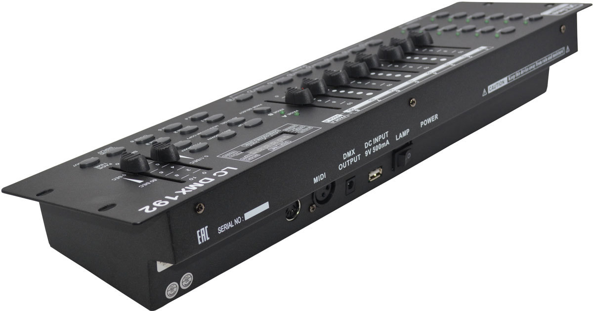 - 192-канальный пульт для 12 DMX-управляемых приборов по 16 каналов на каждый;