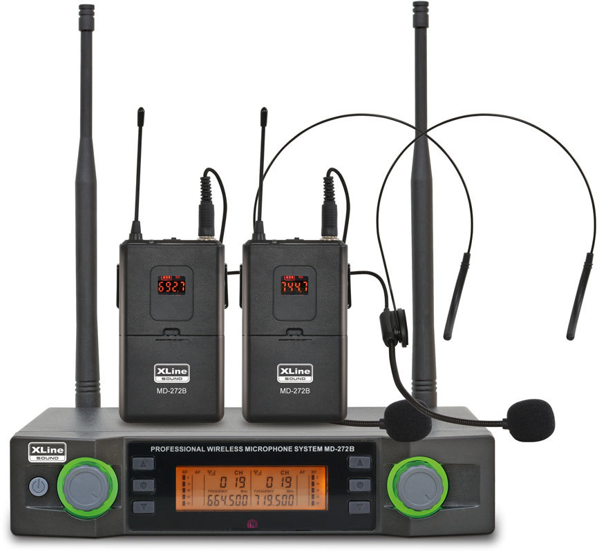 Xline MD-272B - радиосистема двухканальная с двумя поясными передатчиками и головными гарнитурами. 200 фиксированных частот (по 100 на каждый канал). Подстройка частот с помощью IR-порта. 2 XLR разъёма на задней панели.