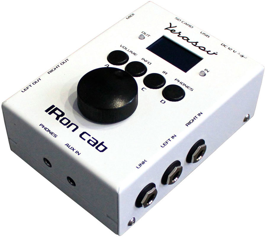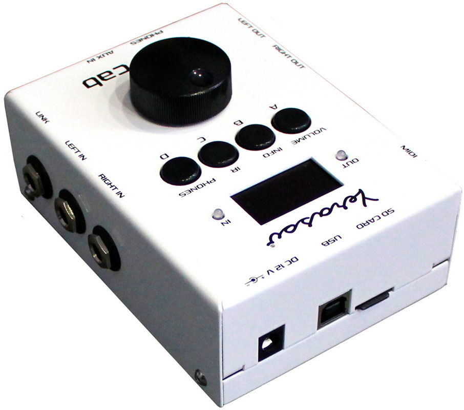Производители IRon сab заранее позаботились о вас и наполнили эту коробочку набором встроенных эффектов. Можно накрутить NoiseGate, Equalizer, Saturation, FX Room/Reverb. Кроме того, устройство способно сохранять и оперировать сотней пресетов, загрузить которые можно с MicroSD Flash-карты. Пользователь может загружать как отдельные импульсы, так и коллекции импульсов в виде CAB-файлов, создаваемых отдельно при помощи программы на РС. На лицевой панели устройства находятся программируемые кнопки быстрого вызова (А-В-С-D). Кроме того, этими же кнопками можно вызывать громкость, громкость наушников, информацию о пресете и импульсе. Основное управление осуществляется с помощью нажимного энкодера и отображается на ярком довольно большом дисплее.