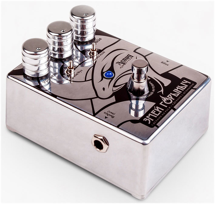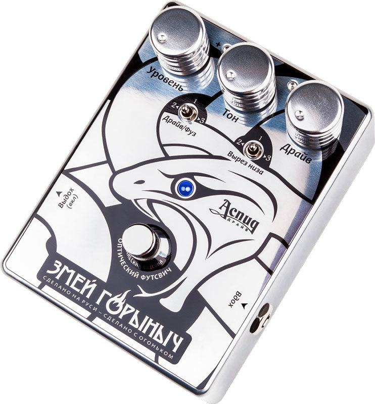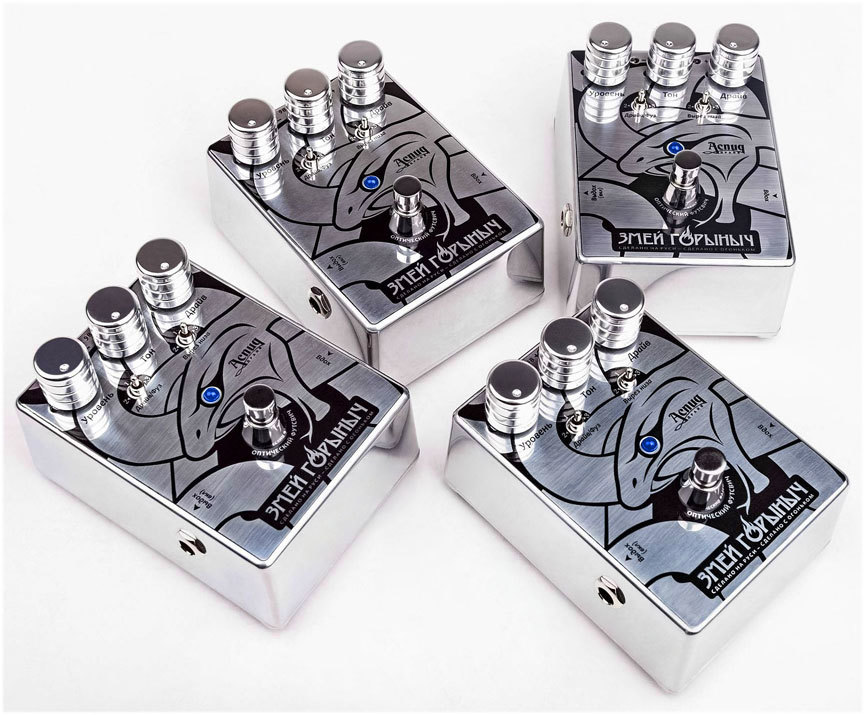 Изначально задачей при создании прототипа был насыщенный звук Вая и Сатриани, но серийный вариант обзавёлся двумя переключателями и стал очень универсальным. Аспид умеет воспроизводить жирный звук Вая и Сатриани, как и подаренный Ваю прототип: для этого нужно установить переключатели "Жир" и "Низ" соответственно в положения "2" и "3". Техническое исполнение: Соединители Neutrik, высококачественные электронные компоненты, печатный монтаж. Зеркальный металлический корпус с неубиваемой графикой. Оригинальная заказная фурнитура. Весь монтаж, сборка, мех.обработка и т.п. - ручная работа.