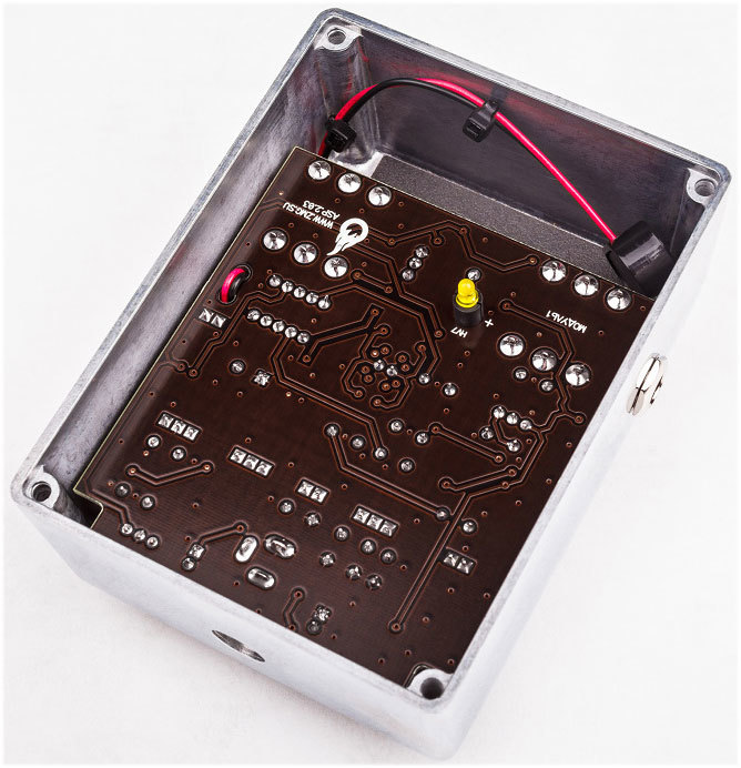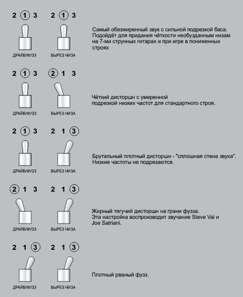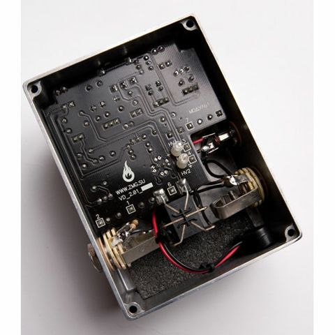 Драйв - плавная регулировка "гейна" Переключатели: Жир - Изменяет структуру звука от дисторшна к фузу. Низ - Это не просто регулятор низа. Этот необычный переключатель варьирует вырез низов перед! исказителем. Можно получить как очень чёткое звучание, так и "сплошную стену звука". Это хорошо слышно на сэмплах. (оба переключателя имеют три положения 1-2-3) Другие особенности: Сверхмалый шум Выключатель питания на задней стенке Малое потребление тока - 3,5мА Оригинальная индикация разряда батареи Оригинальная защита питания.