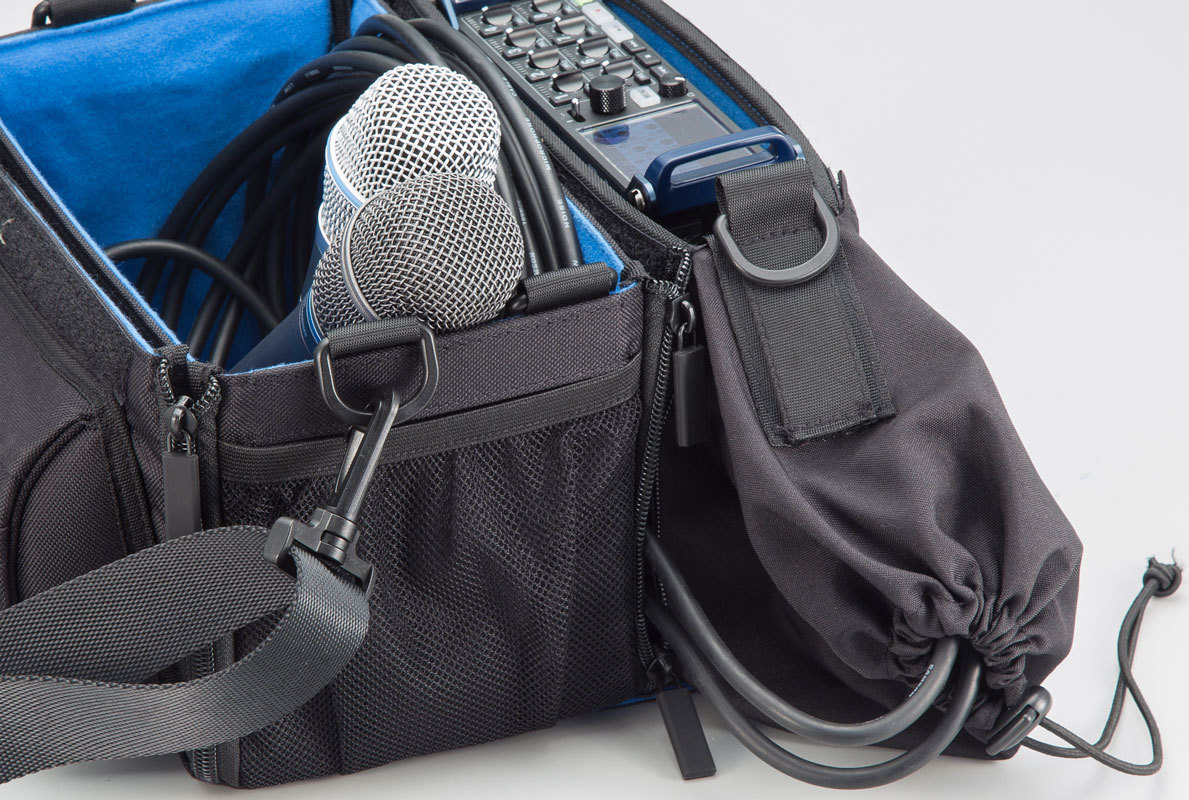 - Боковые вырезы со шнурками для доступа и защиты входного кабеля XLR/TRS