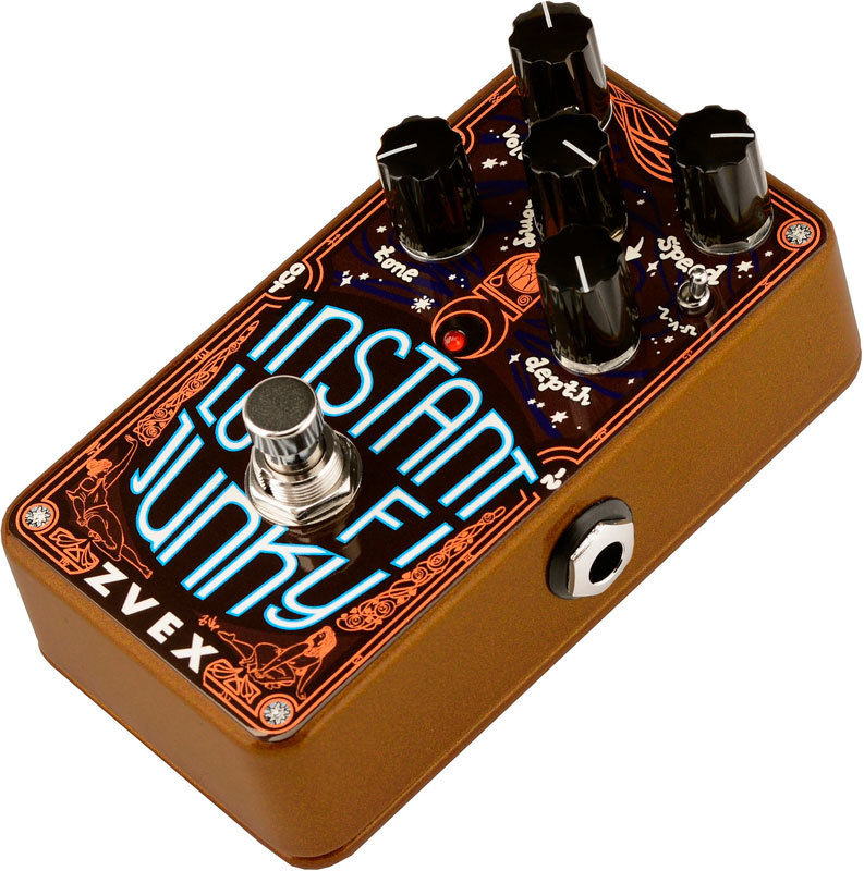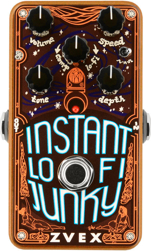 Вертикальная версия педали делает её намного удобнее для простых смертных. Напомним, что Instant Lo-Fi Junky - это звук зажёванной плёнки из педали Lo-Fi Loop Junky - сумасшедшего аналогового сэмплера. В плане звучания это аудиофильский компрессор на THAT микросхеме + вибрато с весьма характерным звуком, свойственным всем эффектам от Zvex. Не вникая в схемотехнику, можно смело сказать, что это аналоговое чудо не имеет аналогов во всём мире. Как бы странно это не звучало. Тем не менее, педаль звучит действительно странно и это то, чего мы все ждём от Zvex. Неповторимый тембр.