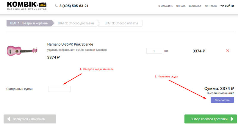 Если у вас есть купон на скидку в нашем магазине, используйте его при оформлении заказа в корзине вот так: